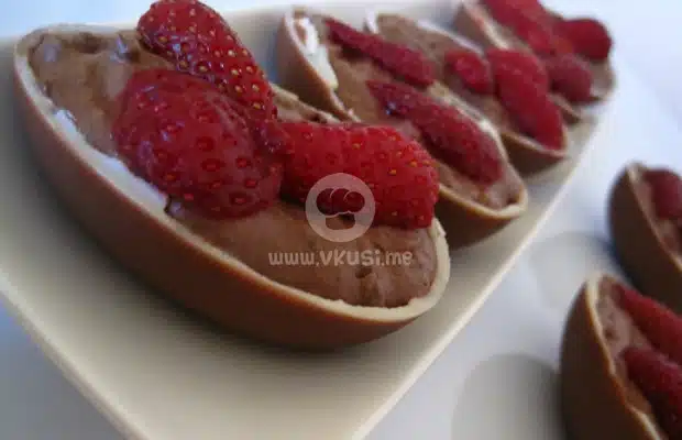 Отваряме kinder яйцата, изваждаме изненадките и …:) Пълним всяка половинка с шоколадовия мус. Декорираме с останалите ягоди, които сме нарязали на филийки.