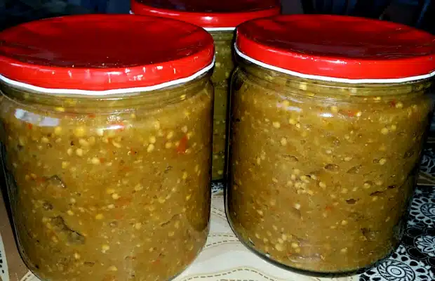 В тава се слагат патладжаните, доматите, чушките, магданоза и чесъна. Разбърква се всичко много добре, прехвърля се в тенджера и сместа се загрява до кипване, маха се от котлона и гореща се налива в затоплени стерилизирани буркани.