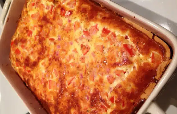 След като извадим блата, слагаме на редове шунка, домат, сирена и така редуваме, докато продуктите свършат. Преди да залеем млечно-яйчената смес, овкусяваме със сол и пипер. Заливаме и леко разбъркваме продуктите с вилица.