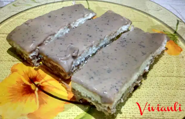 Към сметаната добавяме 100 г черен шоколад и масло. Разтопяваме и заливаме сладкиша. Оставяме да престои в хладилник поне 4 часа. Нарязваме на парчета. Добър апетит!