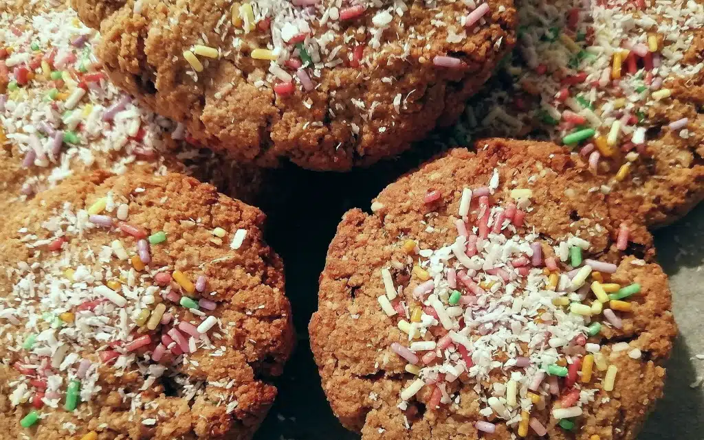 Загрейте фурната на 180 градуса. Изпечете ги до готовност – 10-12 минути. Охладете и ги поръсете с кокосови стърготини и цветни пръчици.