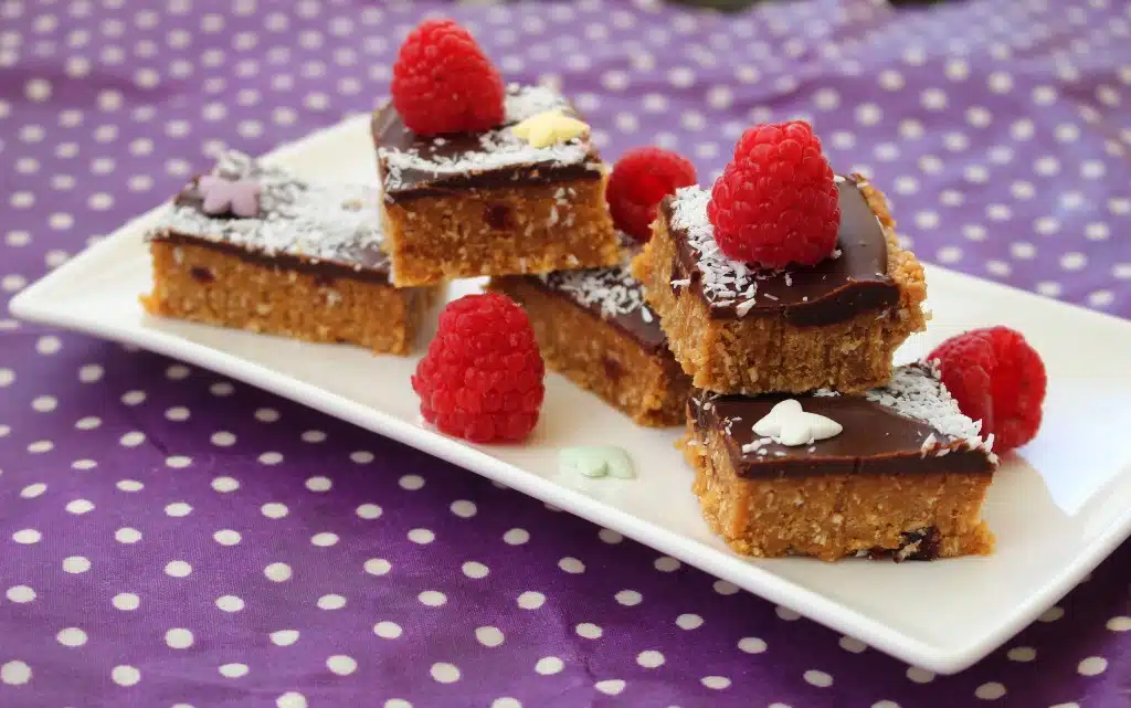 След това изваждаме и поръсваме с кокосовите стърготини, за да може да полепнат. Оставяме сладкиша поне за три часа в хладилник преди сервиране. Нарязваме на квадратчета и гарнираме по желание, в моя случай – с пресни малини.