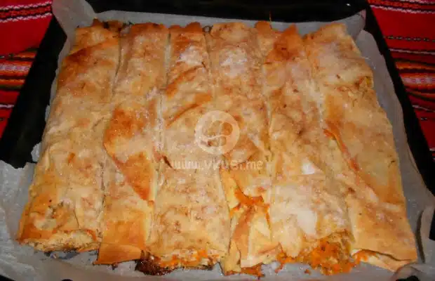 На голяма равна повърхност разпределяте една върху друга точените кори. Смилате ореховите ядки. Почиствате тиквата, нарязвате я и настъргвате на едро ренде