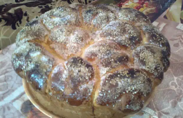 Разтворете маята в малко топла вода и щипка захар. Разбийте добре яйцата със захарта и добавете маята, а след нея и останалите съставки. Замесете тестото и го оставете да втаса добре на топло. След това го разточете на средно дебел лист и го намажете обилно с разтопено масло. Навийте добре на руло и нарежете от него еднакви парчета. Подреждайте ги в намаслена тава и отново оставете да втаса. Намажете с разбитото яйце, поръсете със сусам и захар и сложете да се пече в умерено загряна фурна. Изпечената пита намажете с мед.