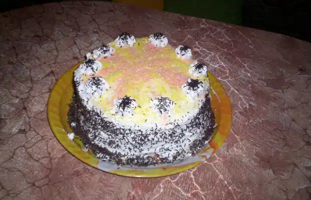 Разбивате 6 яйца с щипка сол. Добавяте захарта и биете с миксер, докато се стопи. Добавяте брашното по малко, като бъркате внимателно с лъжица. Изпичате два блата. След като изстинат, блатовете се сиропират с топлия сироп. Между двата блата се поставя сметана и плодове по желание. Тортата се украсява със сметана и друго според фантазията ви.