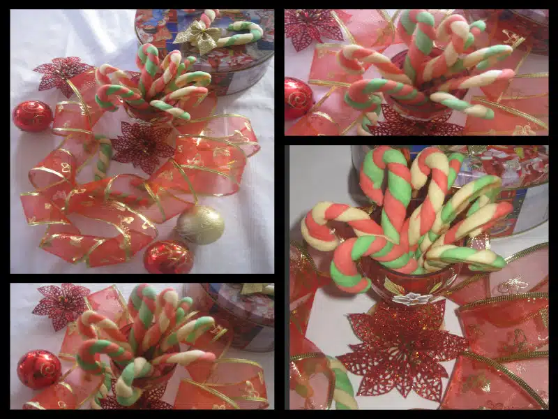 Маслото се разбива със захарта. Добавят се разбитото яйце, млякото и ванилията. Прибавете постепенно брашното и омесете гладко тесто. Разделете го на три части и оцветете две от тях в зелено и червено, третата остава бяла. Увийте всяка топка във фолио и сложете в хладилника за 1час. Късайте от всяка топка и направете малки топчета. Направете фитили и ги усучете две по две от различен цвят. Оформете като бастунчета и ги наредете в тава, застлана с хартия. Печете на 180 градуса около 10-12 минути. Оставете да се охладят и ги съхранявайте в затворена кутия.