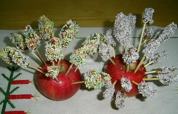 Забождаме ягодите на клечките за зъби. На водна баня разтопяваме шоколада и потапяме всяка ягода в него. След това ги овалваме в пръчиците или кокосовите стърготини. Забождаме ги върху ябълка или портокал и така ги поднасяме.