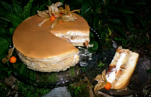 Сложете ринг с диаметър от 26 см. върху поднос за торта. Покрийте дъното с половината козуначени филии. Полейте с половината от карамеления сос, който е останал и намажете с половината крем. Наредете втори пласт от козунака и полейте отново със соса. Покрийте с другия крем и заравнете хубаво тортата. Оставете на хладко да стегне добре.