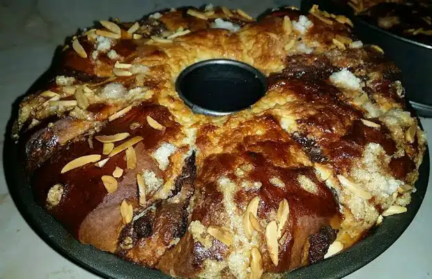 Оставете формите на топло да втаса тестото отново за час, след което с домакинска ножица направете няколко леки странични разрези по тестото с разстояние един от друг, намажете с разбит белтък и поръсете с бадеми и кристална захар.