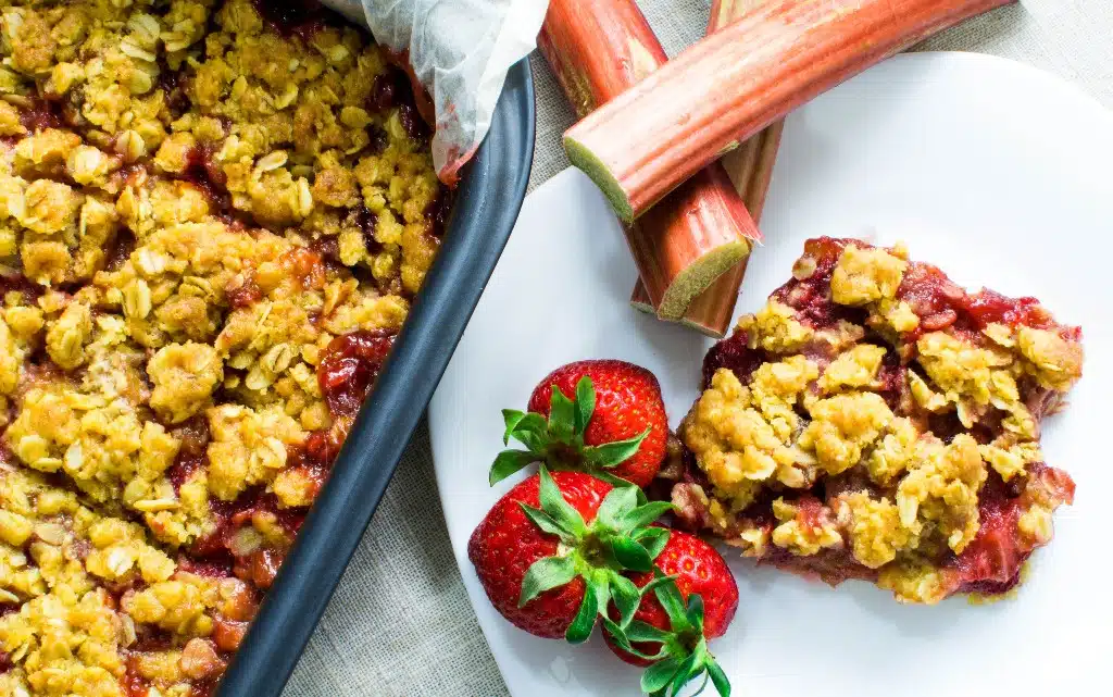 Изсипете сместа от ягоди и ревен над крамбъла (основата), заравнете и поръсете с останалата 1/3 от крамбъла (топинга).