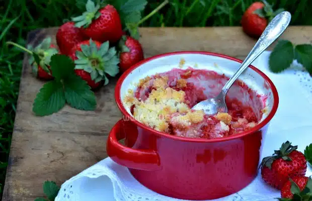 За да подсладим уикенда в сезона на ягодите, ще си приготвим заедно страхотен десерт, в който главният герой са именно тези сладки червени плодчета, любими на всеки. Приготвянето е като детска игра, а вкусът незабравим. Гарнирайте с топка ванилов сладолед и се насладете! 😉