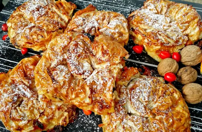 Вземете част от тиквата, поръсете върху крема, ръснете лъжица-две от канелената захар и сложете няколко изцедени стафиди. От дългата част на кората навийте на руло, след това внимателно навийте на охлюв. Възможно е на места да се разкъса, но това не е фатално. Сложете баничката в плоска голяма тава, постлана с хартия за печене.