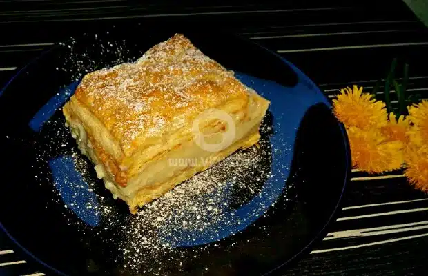 Вземете тавичката и сложете цялото парче бутер тесто, отгоре изсипете целия крем и изравнете. Най-отгоре подредете разрязаните парчетата тесто, като леко ги натиснете в крема. Оставете крем питата да се охлади и приберете в хладилник за минимум 6 часа, за да може да стегне.