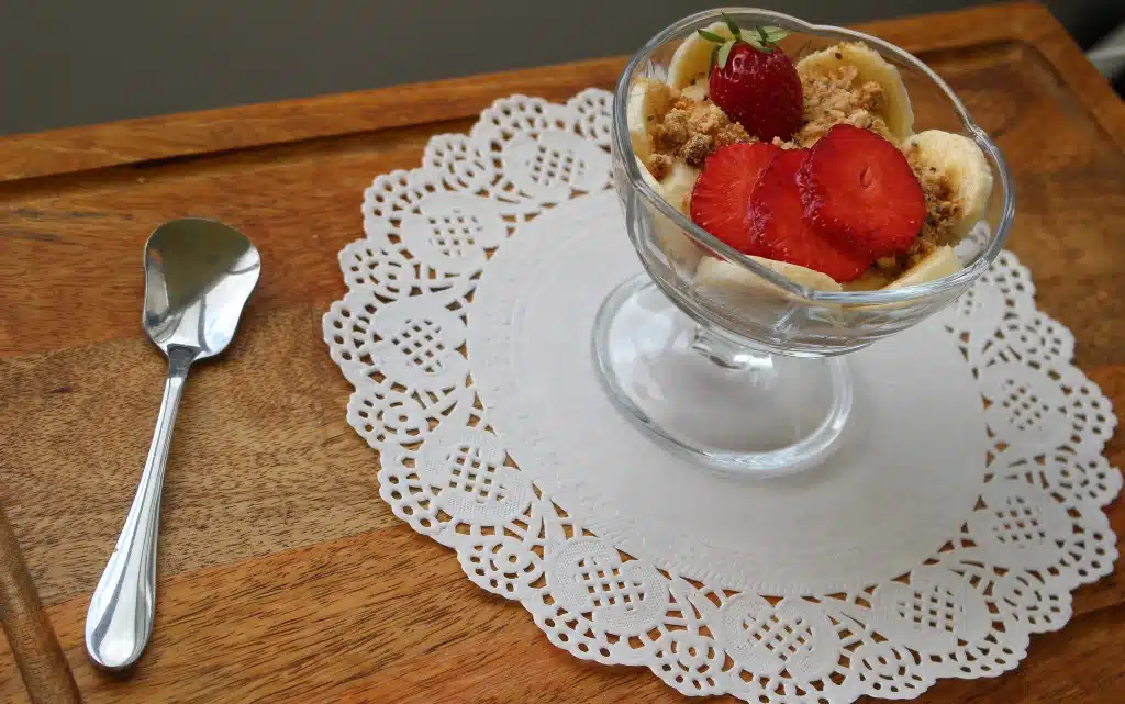 В подходящи чашки слагаме от шоколадовия крем, отгоре белия. Гарнираме с нарязаните плодове и натрошени бисквитки.