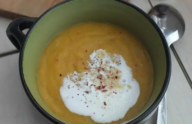 Леща се измива добре. Картофът се реже на много дребно. Всичко се слага в тенджера. Залива се с водата. Добавят се подправките и бульонът и се оставя на среден огън да ври. След като омекнат картофите е готово. На лещата ѝ трябва много малко. Оставя се леко да се охлади и се пасира.