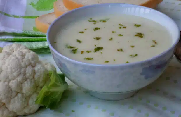 Налейте 1 л гореща вода и сипете нарязаните на малки кубчета картофи и накъсания на малки розички карфиол. Варете зеленчуците около 20 мин. и подправете със сол и бял пипер на вкус.