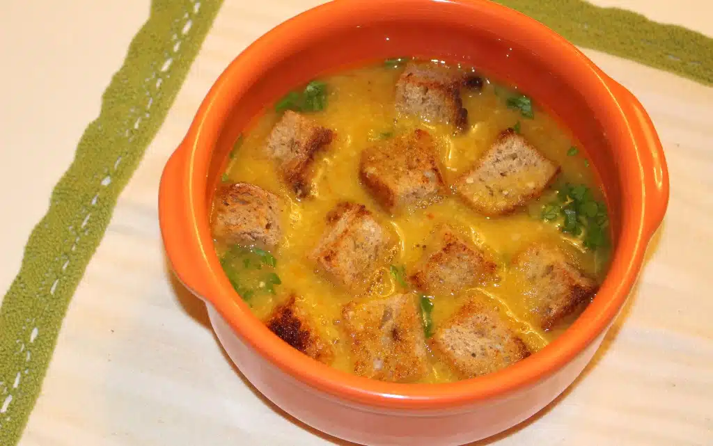Готовата супа пасираме до гладкост и поднасяме с изпечените крутони и ситно нарязания магданоз.