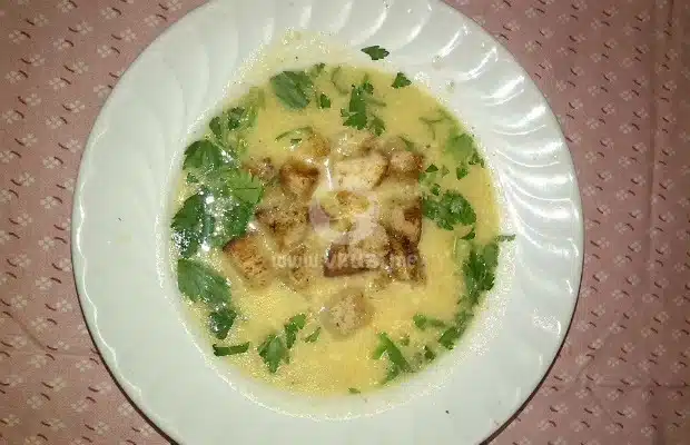 През това време си правите крутони. Ако желаете, може да направите застройка от жълтъците. Сервирайте с крутоните и ситно нарязан магданоз. Добър апетит!