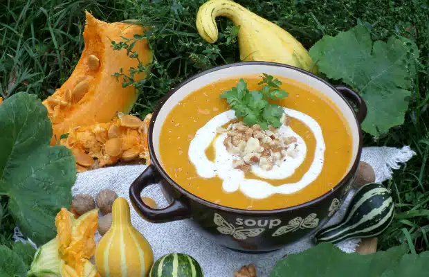 Времето категорично крещи, че е есен. Листата започват да падат, упоритите домакини пълнят и последните буркани със зимнина, а денят все повече намалява. За да не позволите есенната депресия да ви покори, е необходимо да се заредите с много витамини. Няма по-добра идея от една топла крем супа, приготвена от царицата на есента – тиквата. Съставът на тази супа изобилства от витамини, а ароматните подправки я правят неустоимо вкусна. Добър апетит! 🙂