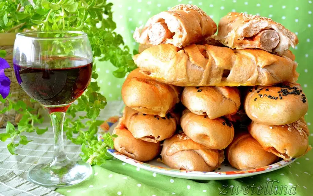Намазваме с разбитото яйце с малко вода и поръсваме със сусам. Печем в предварително загрята на 200 градуса фурна до златисто.