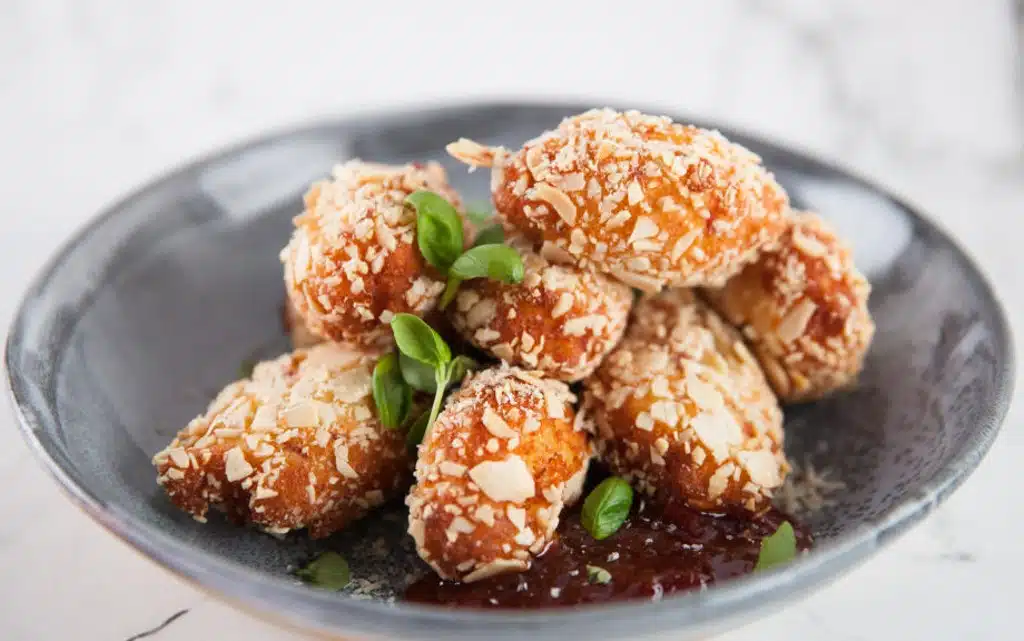 С помощта на две лъжици оформете продълговати кюфтенца. Оваляйте всяко добре в бадемите.