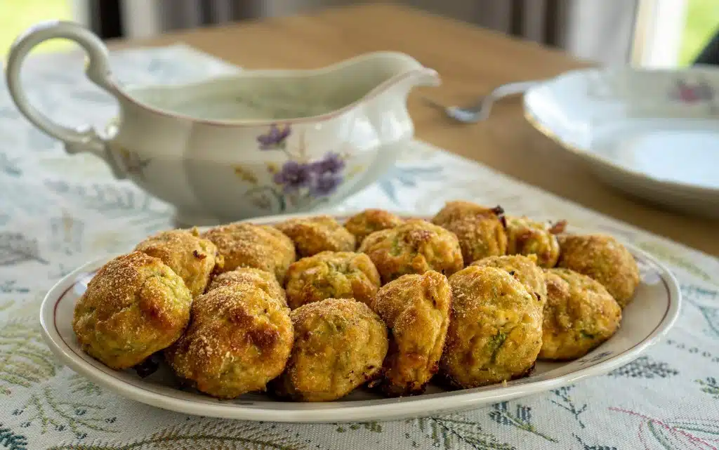 Сместа се размесва добре. Оформят се малки кръгли топчета, които се овалват в галета и се подреждат в тава, покрита с хартия за печене.