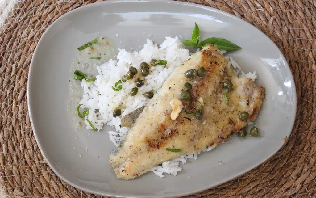 Добавяме в тигана маслото, чесъна и каперсите и доливаме бульона (водата). Подправяме, ако е необходимо и след минута, колкото да се смесят ароматите, отстраняваме рибата от котлона.