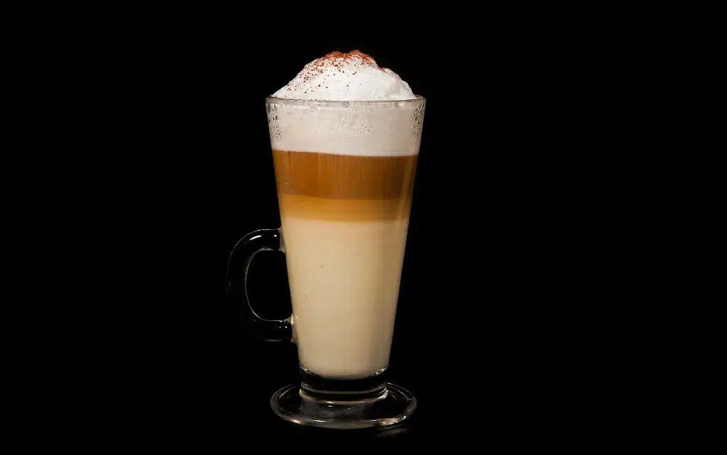 Пасирайте малко лед с канела, инстантно кафе и захар до получаването на пухкава гъста смес. В чаша налейте млякото (колкото ви е сладко) и няколко кубчета лед. След това сипете от замразената пасирана субстанция.