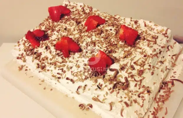 Днес ще ви изкуша с една лека и много вкусна торта. Комбинация от бисквити, кисело мляко, ягоди и бишкоти… Да започваме!
