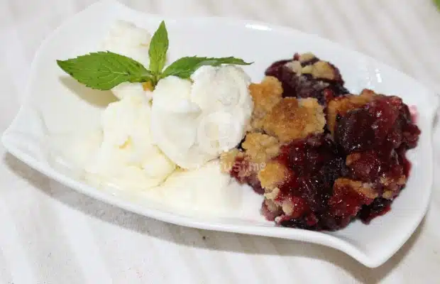 Поднасяме още топлия крамбъл с топка ванилов сладолед.