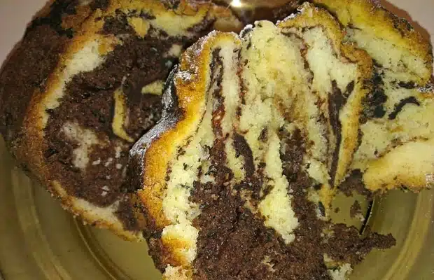 Намажете форма за кекс с масло и поръсете с брашно, изсипете жълтата смес, отгоре поръсете с малко какао и сложете кафявата смес.