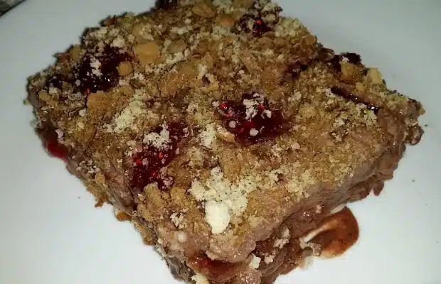 Следва реденето на втория пласт бисквити, отново сладко и отгоре от шоколадовия крем. С третия ред бисквити се процедира по същия начин, накрая се завършва с крем. Отгоре натрошете от бисквитите, ако са ви останали и поръсете със смлени орехи.