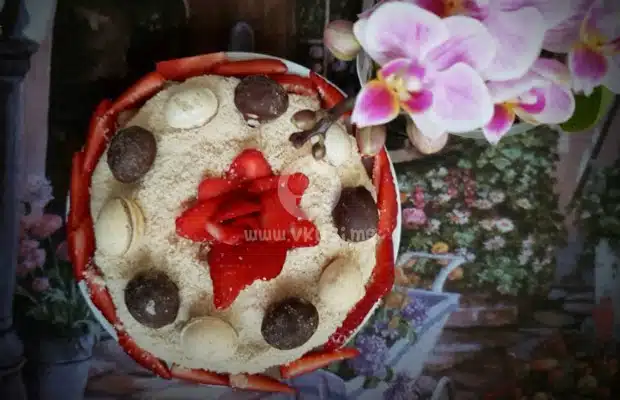 Украсете с продукти по ваш избор (аз използвах ягода и вафлени яйчица с пълнеж) и охладете тортата. Разрежете и я поднесете студена. Да ви е сладко!