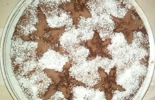 Водата и захарта се слагат на котлона да поврат за около 5-6 минути. Разбъркват се сметаната и течния шоколад до получаването на хомогенна смес. Всеки блат се залива с част от захарния сироп, намазва се с получения крем и с нарязани на ситно орехи. Последният блат се оформя с останалия крем, наръсва се по желание с кокосови стърготини и се оформят звезди от какао. Оставя се за няколко часа в хладилника. Добър апетит!