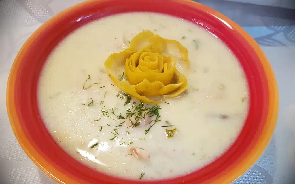 В купичка се разбиват киселото, прясното мляко и жълтъците. Добавят се към кашичката и се разбърква, докато се посгъсти. Слага се пилешкото месо и ястието се оставя да си къкри на умерен огън за около 15-20 минути. Малко преди да се свали от огъня се подправя със скълцан копър, черен пипер и изцеден лимонов сок. Вкусът се допълва чудесно. Добър апетит!