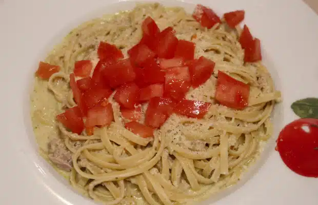 Сваряваме пастата, според указанията на опаковката. През това време запържваме скълцания на ситно чесън в малко зехтин. Добавяме каперсите, сметаната и малко вода.