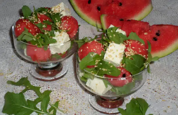 В две десертни чаши подредете динята, сиренето и руколата. Полейте със зехтин и сока от грейпфрут. Поръсете със сусам.