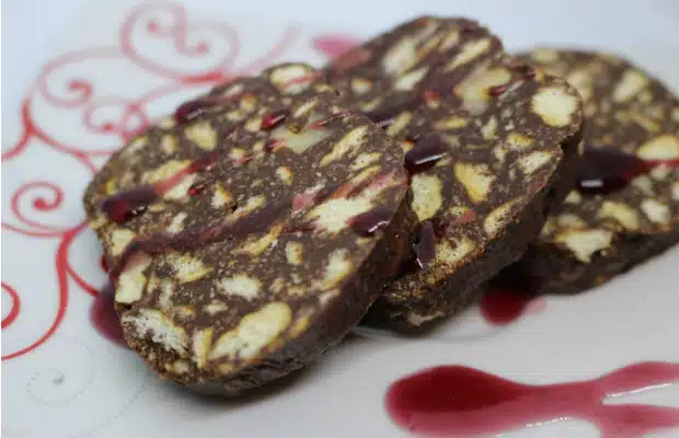 Днес представям една класическа рецепта, която лично мен винаги ме връща в детството! Това е любимият на всички „Сладък салам“. В моята версия присъства винаги някакъв алкохол, но ако десертът е предназначен за деца, може да прескочите тази част.