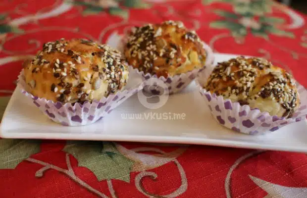 В силиконови формички за мъфини сипваме с помощта на лъжица от сместа. Формичките трябва да са запълнени на максимум 2/3 от обема, за да може мъфините да се надигнат и да се получи така характерното за тях „калпаче“ или „шапчица“. Поръсваме ги обилно със семената. Печем в предварително загрята фурна на 180 градуса за около 25-30 минути.