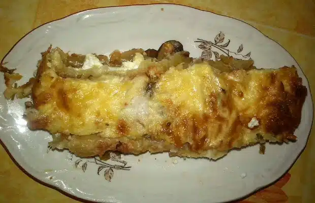 Половината смес се поставя на дъното на тавичка, в която ще се пече яденето. Сиренето се натрошава и към него се прибавят яйцата, получената смес се използва за корите.
