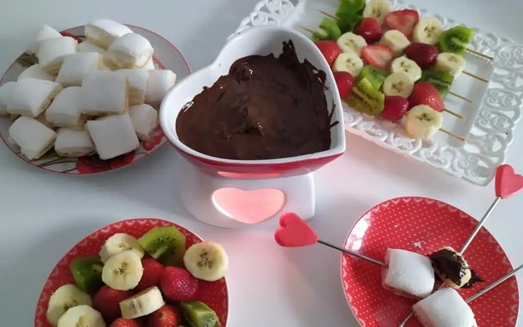 В застлана с хартия за печене и поръсена с пудра захар тавичка се излива сместа и се оставя да съхне поне няколко часа. След което се нарязва на кубчета. За свежо и цветно допълнение приготвяме и плодови шишчета, които са от сезонни, пресни плодове. Бон апети!