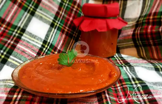 Морковите и чушките се почистват, нарязват се на едро и се изсипват в голяма дълбока тава. Към тях се прибавят доматите и патладжаните. Добавят се захарата, солта, олиото и оцета.