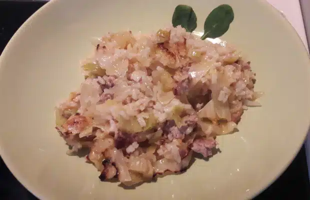 През това време се нарязва празът на ситно и се задушава отделно от киселото зеле. Към него се добавят каймата и оризът също за около 10 минути.