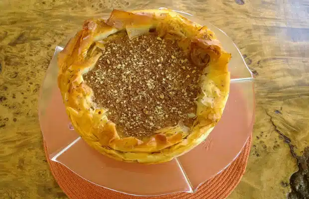 В кръгла форма с диаметър 20-25 см. (с падащ пръстен) за печене се редят корите ветрилообразно, като се поръсват с разтопеното масло, захар и орехи. Корите трябва да висят извън формата.
