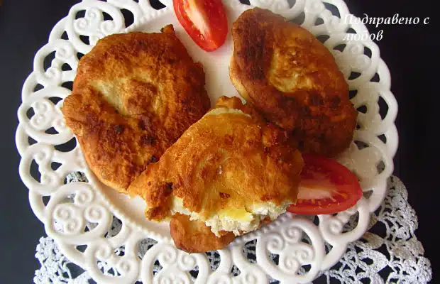 На сутринта вадим тестото, късаме малки топки колкото детски юмрук, разточваме ги леко, поставяме по средата малко от пълнежа и пържим в загрято олио от двете страни.