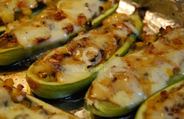 Измийте добре всички зеленчуци. Разрежете патладжаните и тиквичките на две. С чаена лъжичка издълбайте по-голямата част от вътрешността на зеленчуците. Така ще получите мексикански ладии, които ще напълним със специална смес.