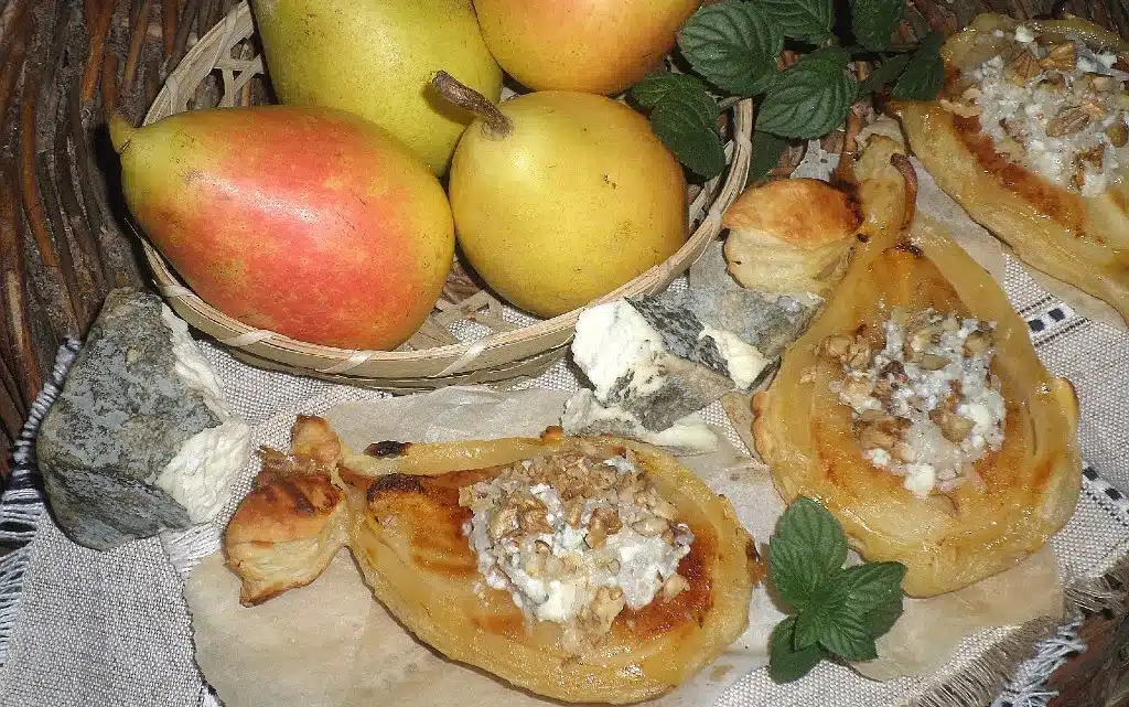 Изрежете от бутер тестото шест правоъгълника и ги наложете върху крушите плътно. С остър нож изрежете излишното тесто, като оставите изрязано листенце до дръжката. На тези круши, който нямат дръжки, изрежете тестото така, че то да имитира дръжка. Направете малки дупчици по тестото на всяка круша и я намажете с разбит жълтък. Печете в загрята фурна на 200 градуса за около 15-18 минути до златисто.