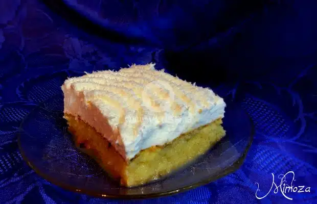 Крема се разпределя върху реването, заглажда се и се поръсва с кокос. Прибира се за една нощ в хладилник.