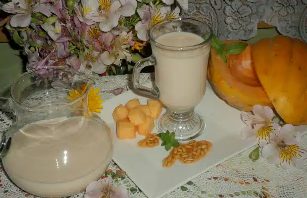 Разрежете един пъпеш и издълбайте с лъжица семките. Изсипете ги в блендер или робот и разбийте. Добавете прясното мляко и отново разбийте. Овкусете със захарта и канелата и разбийте отново. Оставете сместа да почине 10-15 минути. Прецедете напитката в кана. Охладете я добре преди консумация.