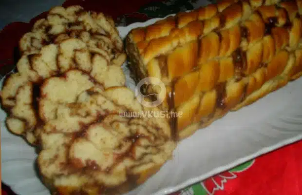 Прегъва се на две през средата и леко се доразточва. Нарязва се на ивици по 2 см. Всяка ивица се усуква като мартеница и след това всички ивици се нареждат близо една до друга в тава с хартия за печене. Оставят се още 20 мин да починат.